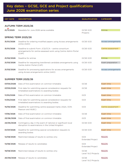 GCSE, AS and A level exams will be held between 7th May and 17th June 2026. You must be available for the whole of the exam period. Exam board timetables for the 2025 summer exam series of GCSEs, AS and A levels are available on the Joint Council for Qualifications website.